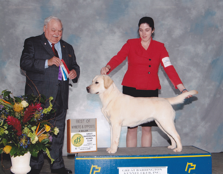 Sarah and Scarlett set out in early January 2013 to see how things would go. With Sarah's expert handling and Scarlett's enthusiasm, they achieved her AKC Championship including two 3-point back-to-back majors under Judges Ms. Marilyn Spacht on February 2, 2013 and Mr. James White on February 3, 2013.