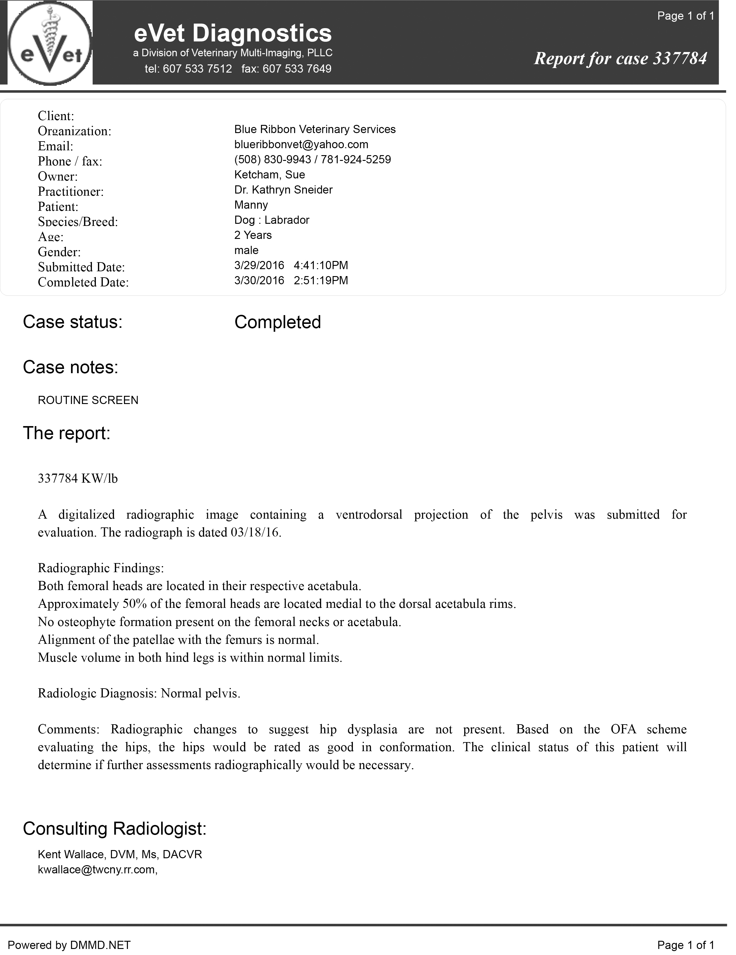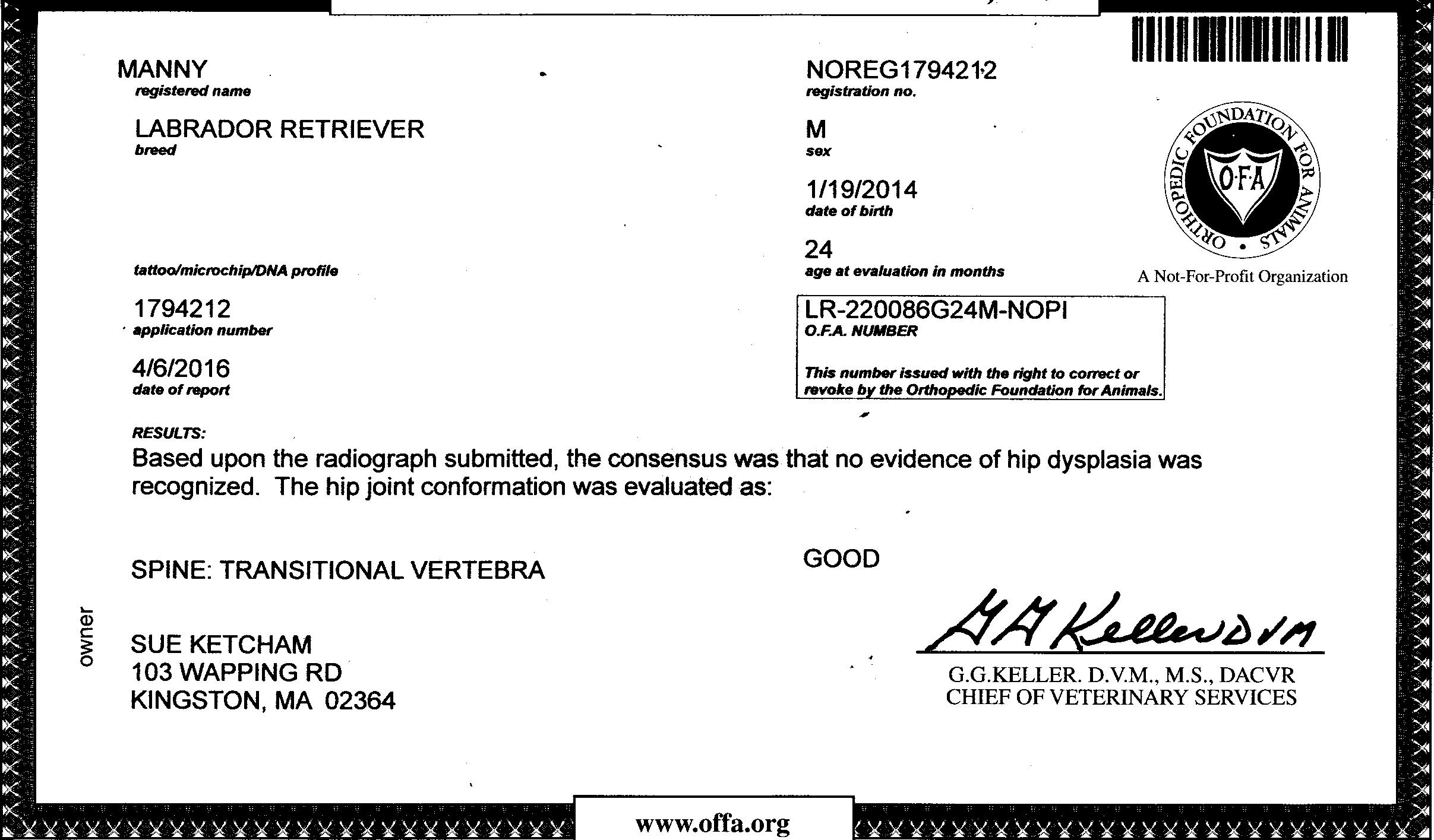 OFA Hips Good, OFA Elbows Normal, CERF Normal, Cardiac Normal by Echocardiogram, EIC Clear, CNM Clear, Optigen Normal